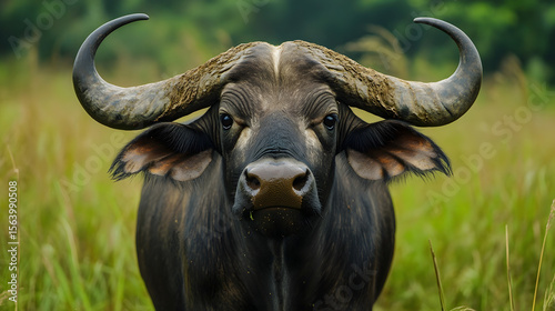 Naklejka premium Close-Up Portrait of a Powerful African Water Buffalo with Large Horns...