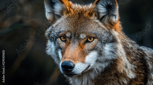Naklejka premium Close-up portrait of a red wolf with intense amber eyes, looking directly at...