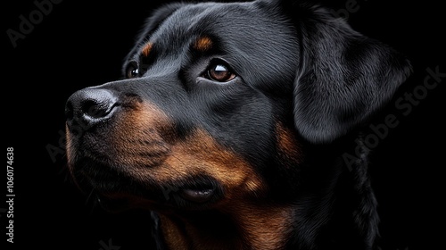 © Sujito, Fototapeta premium Close-up portrait of a Rottweiler against a dark background.