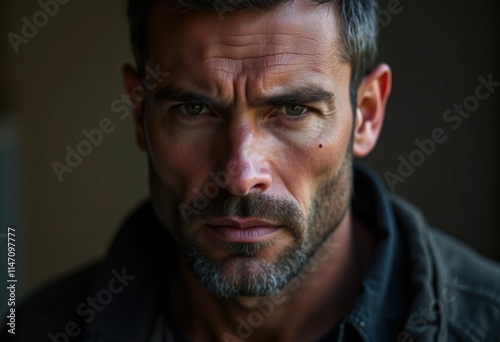 © Vibudhaart, Fototapeta premium Close-up portrait of a serious, middle-aged man with intense eyes and stubble.