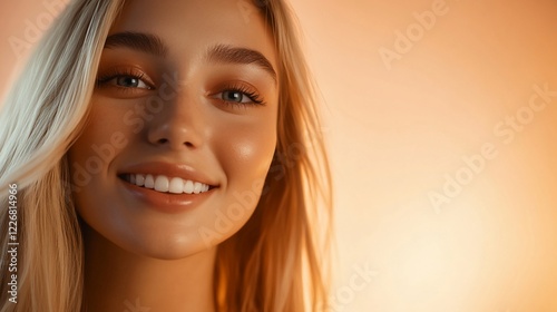 Fototapeta premium Close-up portrait of a smiling blonde woman with natural makeup and glowing skin