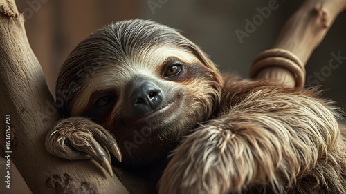 Naklejka premium Close-Up Portrait of a Smiling Two-Toed Sloth Resting on Tree Branch