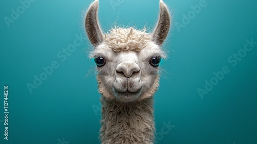 © PRASETIYO, Obraz premium Close-up portrait of a smiling white llama against a teal background.