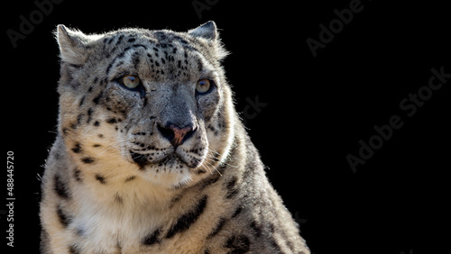 © Patrick Rolands, Fototapeta premium Close up portrait of a snow leopard isolated on a black background with room for text