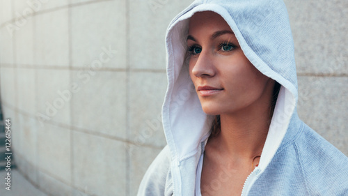 Obraz premium Close up portrait of a sporty woman sitting outside
