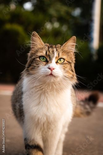 Fototapeta premium Close-up portrait of a tabby cat with green eyes outdoors