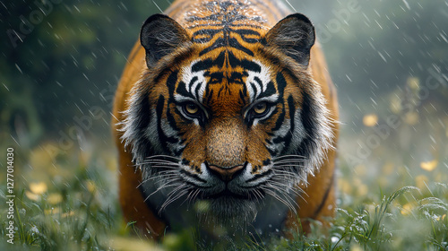 Fototapeta premium Close-up portrait of a tiger in the forest with focused eyes and raindrops