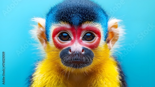 © Eakanan, Fototapeta premium Close up portrait of a vibrant Black capped Squirrel Monkey with striking blue red and yellow facial markings against a bright blue background