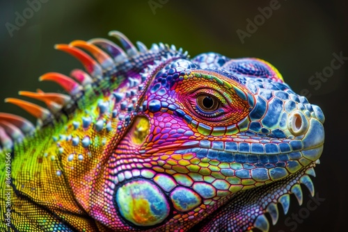 © Amni, Fototapeta premium Close-up Portrait of a Vibrant Green Iguana