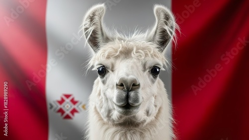 © amrets, Naklejka premium Close-up Portrait of a White Llama with a Peruvian Flag Background, Symbolizing Andean Culture.