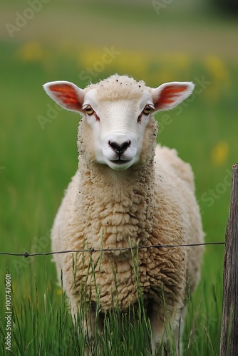 Obraz premium Close up portrait of a white sheep standing in a green meadow