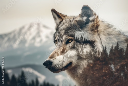 © Angus.YW, Obraz premium Close-up portrait of a wolf against the background of the mountains. Double exposure image.