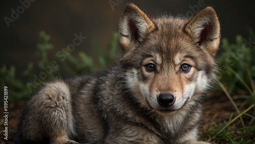 Fototapeta premium Close-up portrait of a wolf cub in a wild