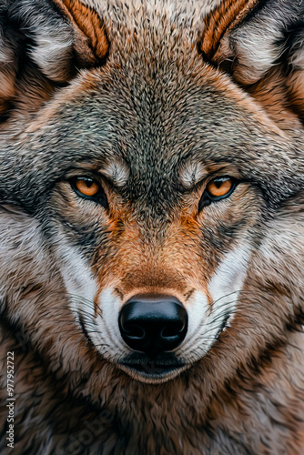 Fototapeta premium Close-up portrait of a wolf with detailed facial features.