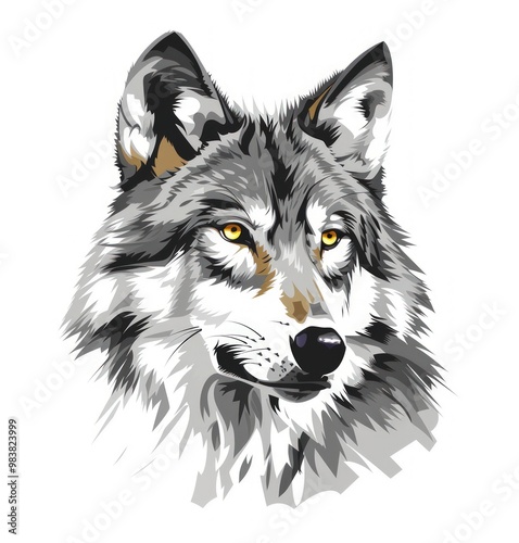 © ika ndari, Naklejka premium Close-up portrait of a wolf with piercing yellow eyes.
