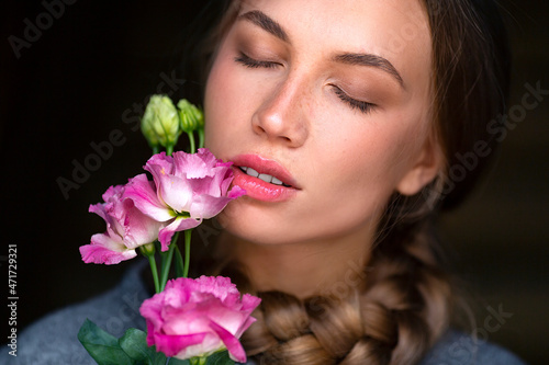 Fototapeta premium Close-up portrait of a woman with a flower with closed eyes.