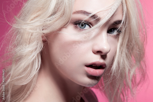 Obraz premium Close-up portrait of a woman with beautiful eyes and blonde hair on a pink...