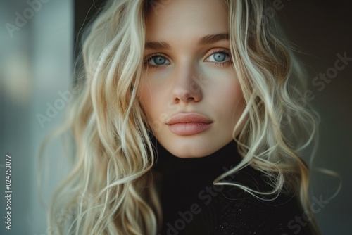 Fototapeta premium Close-up portrait of a woman with captivating blue eyes and blonde curls