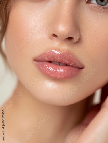 Obraz premium Close-up portrait of a woman with eyes closed highlighting glossy lip makeup...