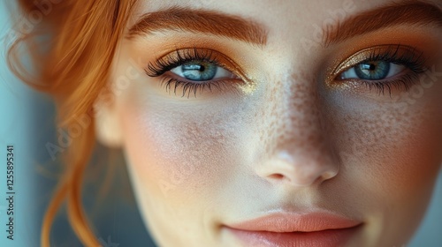 Fototapeta premium Close-up portrait of a woman with freckles and red hair, showcasing her blue eyes and subtle makeup.