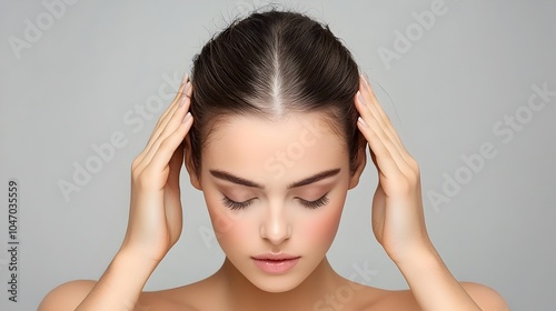 © thanarak, Fototapeta premium Close up portrait of a woman with smooth glowing skin and delicate baby hairs framing her face in a soft wispy hairstyle for a polished refined and youthful aesthetic