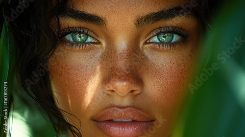 © aritha, Fototapeta premium Close-up portrait of a woman with striking green eyes surrounded by lush foliage.