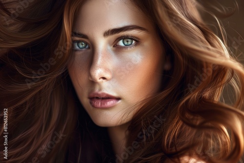 Fototapeta premium Close-up portrait of a woman with stunning green eyes and luxurious wavy hair