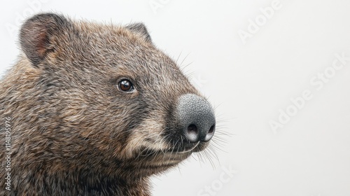© Theeranan, Naklejka premium Close-Up Portrait of a Wombat in Soft Light Capturing the Texture of Fur and Unique Features of This Australian Native Animal Against a Subtle Background