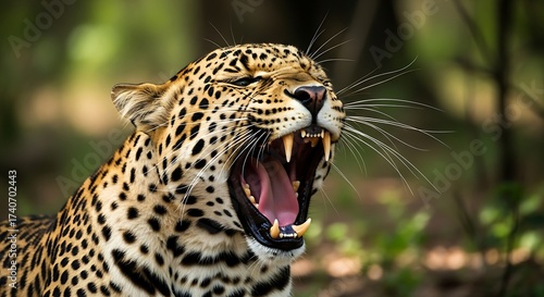 Naklejka premium Close-up Portrait of a Yawning Leopard with Sharp Teeth and Rosy Tongue in...