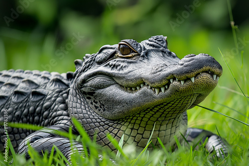 © Darya, Fototapeta premium Close-Up Portrait of a Young Alligator Resting in the Grass