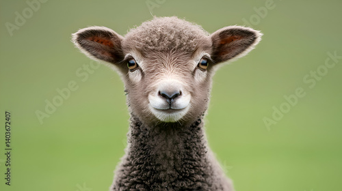 © Sujito, Fototapeta premium Close Up Portrait of a Young Brown Lamb Against a Green Background