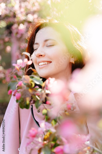 © vadimverenitsyn, Fototapeta premium Close-up portrait of a young girl with a smile on her face standing around a blooming rose tree in the garden. The concept of spring and allergy to blossom.