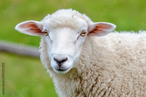 Fototapeta premium Close up portrait of a young lamb in a green pasture. Farming animal with white wool showing adorable face for agricultural theme.