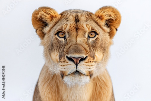 © Init, Fototapeta premium Close-up portrait of a young lioness against a bright white background. Her intense gaze and tawny fur are striking.