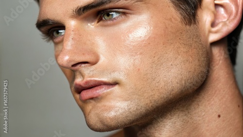 Fototapeta premium Close-Up Portrait of a Young Man with Clear Skin and Dramatic Lighting