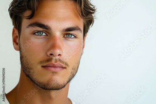 © J. Grayscale, Fototapeta premium Close-Up Portrait of a Young Man with Striking Blue Eyes and Natural Expression