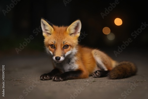 Fototapeta premium Close-up portrait of a young red fox lying on the ground at night