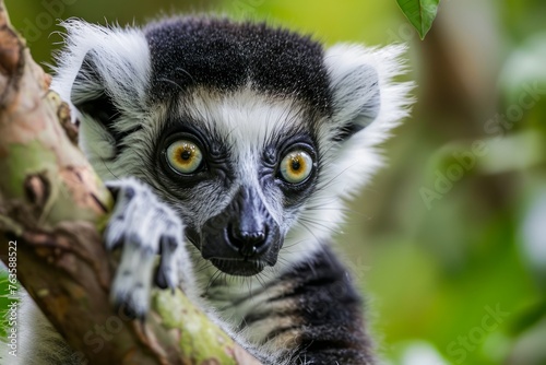 © pisan, Fototapeta premium Close-Up Portrait of a Young Ring-Tailed Lemur (Lemur catta) Clinging to a Tree in a Lush Green Forest Environment with Vivid Yellow Eyes