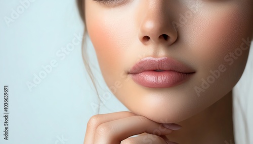 Obraz premium Close-up portrait of a young woman's face showcasing smooth skin, subtle...