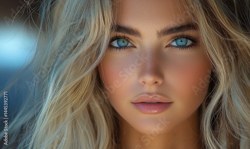 Obraz premium Close-up portrait of a young woman with blonde hair and striking blue eyes....