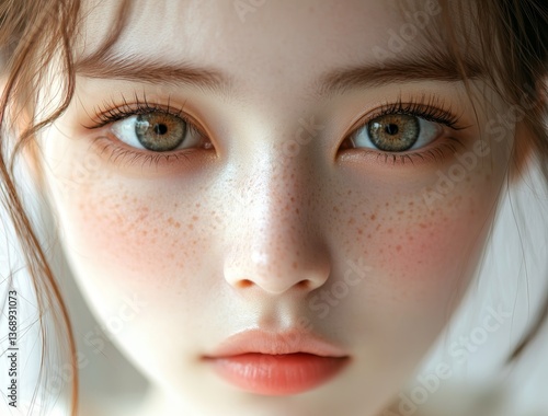 © Irina Kozel, Fototapeta premium Close-up portrait of a young woman with freckled skin and striking eyes, featuring a minimalistic aesthetic