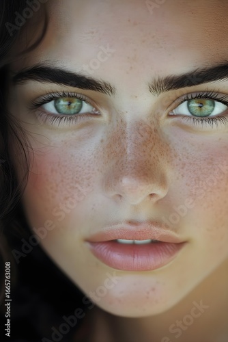 Fototapeta premium Close-up Portrait of a Young Woman with Freckles and Green Eyes