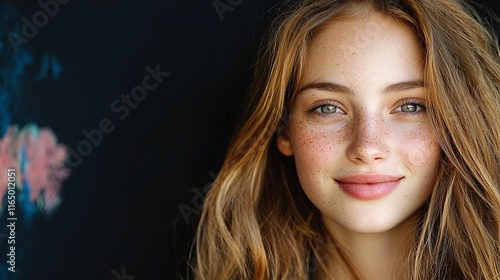 © Nasywa, Fototapeta premium Close-up portrait of a young woman with freckles and long reddish-blonde hair, smiling gently against a dark background.