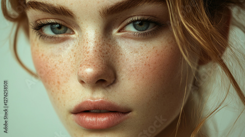 © Inspire Shots Hub, Fototapeta premium Close-up portrait of a young woman with freckles, soft natural makeup, and a calm expression, showcasing beauty, innocence, and natural elegance.