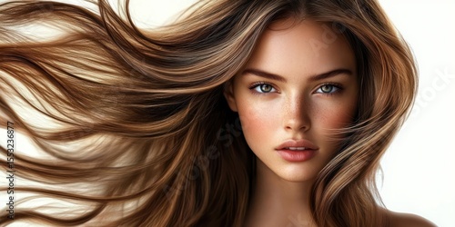 Obraz premium Close-up portrait of a young woman with long flowing light brown hair, clear...