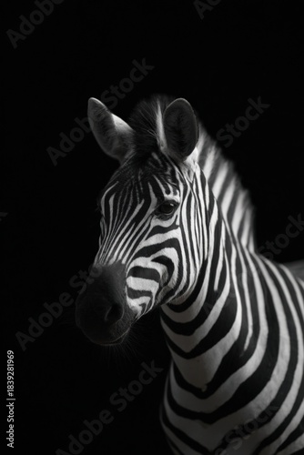 © Andrii Zastrozhnov, Obraz premium Close-up portrait of a zebra against a black background