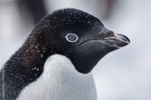 Naklejka premium Close up portrait of Adelie penguin at Brown B showcasing its distinctive features in a snowy environment during daylight