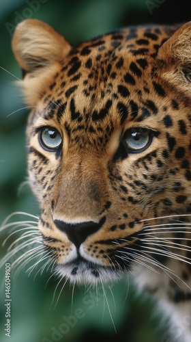 © GenMotion, Fototapeta premium Close Up Portrait of Amur Leopard Showing Striking Blue Eyes and Spot Pattern with Soft Green Bokeh Background