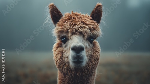 © kirania, Obraz premium Close-up Portrait of an Alpaca with Brown Fur Looking Directly at the Camera.
