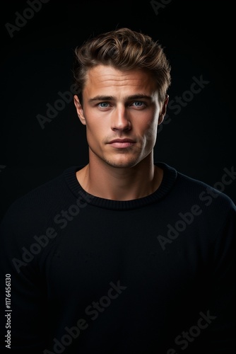 Fototapeta premium Close-up portrait of an elegant young European man with expressive blue eyes, confident gaze, short smooth haircut, light brown hair, dark sweater, high-quality RAW image with dark background